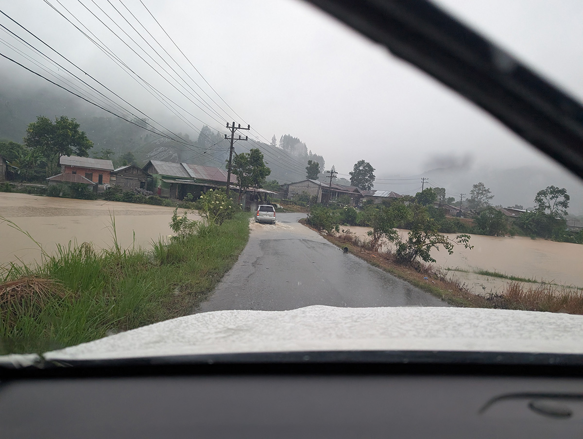 In diezelfde nacht keek ik opnieuw op de kaart. Het gebied van overstromingen was zich over de nacht heen gaan uitbreiden en voornamelijk op routes die essentieel zijn om het gebied uit te komen. Richting Lhokseumawe bijvoorbeeld; een regio waar veel wegen essentieel zijn voor het verkeer, voedsel en brandstof. De volgende ochtend reden we het dorp in waar we al snel geconfronteerd werden met de eerste schade. Een stuk weg was weggespoeld, precies op een smalle kam van een heuvel. Normaal al een kwetsbaar punt. Nu hing een deel van het asfalt letterlijk boven de leegte. Net breed genoeg om er voorzichtig overheen te rijden. Even later zagen we rivieren die veranderd waren in kolkende, bruine stromen. In het dorp zelf stond het water op straat. Winkels liepen onder. Huizen ook. Het water stond soms tientallen centimeters hoog met een zichtbare stroming.